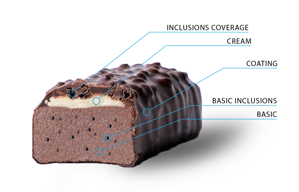 - Stage 3 : energetic or protein base with protein/energetic cream or caramel layer above, with coating.